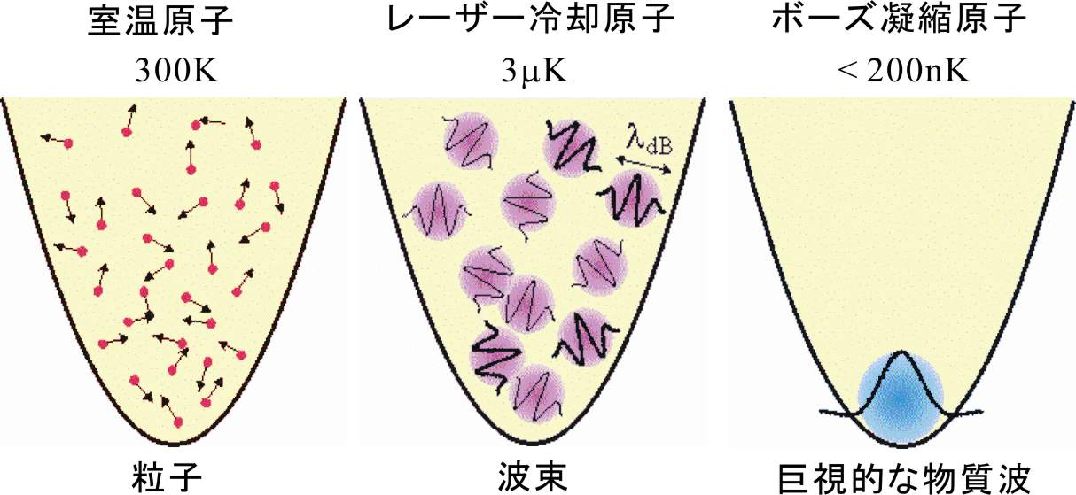 原子は室温では非常に小さな粒子としてふるまいますが(図1左)、この原子の温度をレーザー冷却によって室温の100万分の1以下に下げると原子は波の性質が顕著に現れ粒子としてよりも波束としてふるまいます(図1中)。さらに原子の温度を下げて隣合う原子同士の波束が重なり始めると多くの原子の波束が全て同一になってしまいます(図2右)。これはボース・アインシュタイン凝縮と呼ばれる現象で、1924年にボースとアインシュタインによってその存在が予言されました。