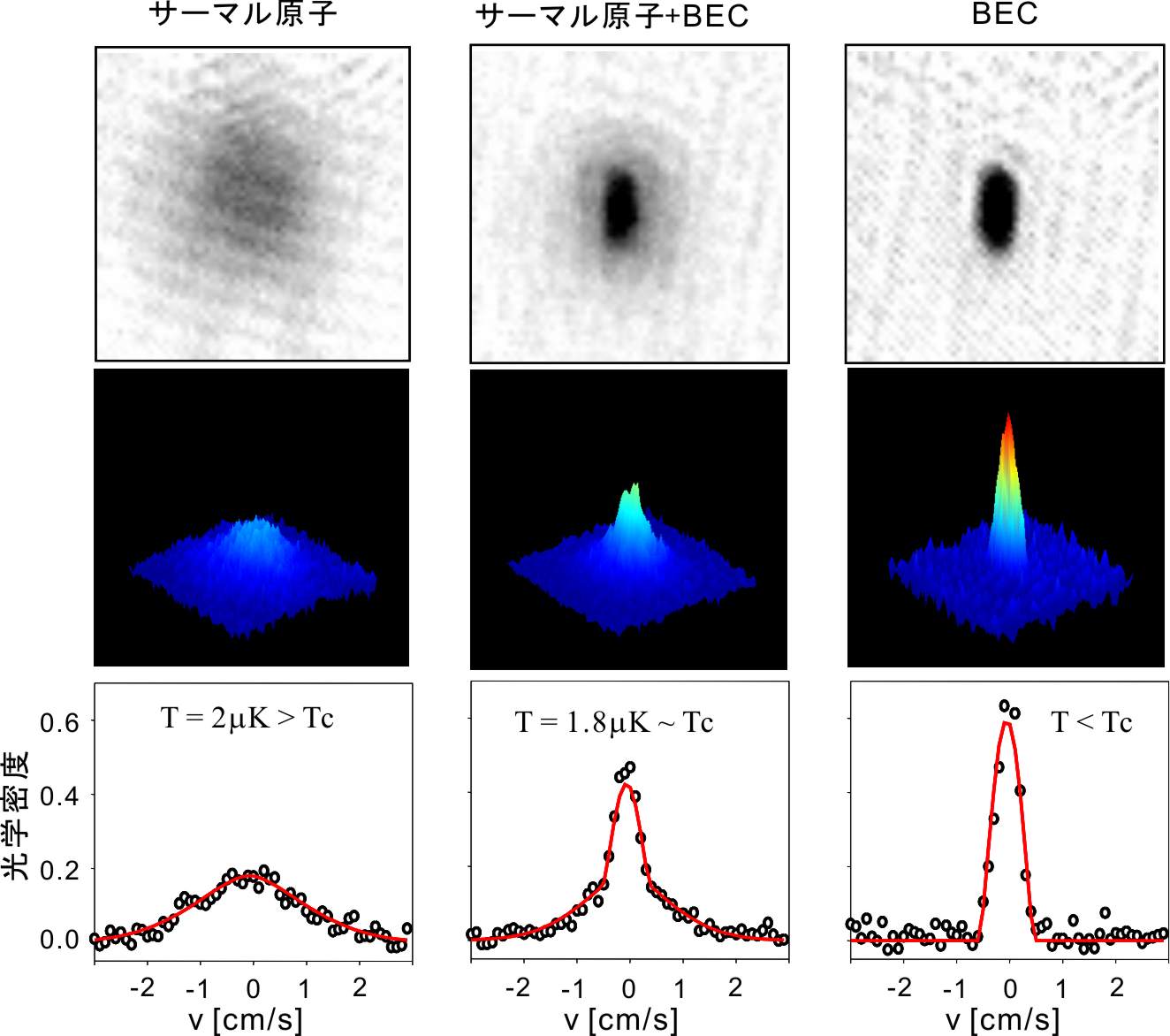 図2 BEC相転移付近における原子の速度分布