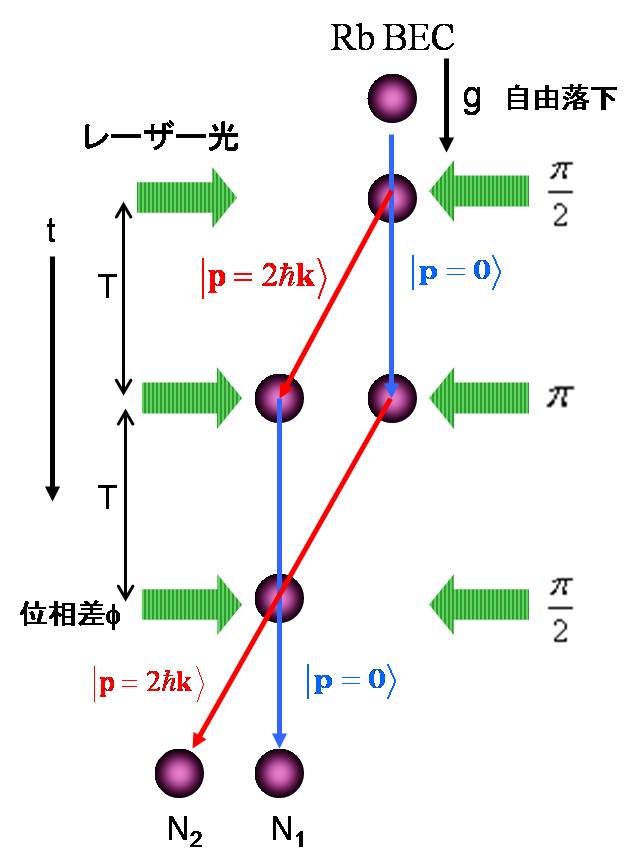本研究室ではレーザー冷却87Rb原子を用いた原子干渉計による重力加速度計の開発およびアトムチップ上のBEC原子を用いた原子干渉計の研究を行っています。下図にボース凝縮(BEC)原子を用いた原子干渉計の構成例を示します。BEC原子は対向する2本のレーザー光によって二つの運動量状態に分割され、同様にレーザー光によって反射された後、再びレーザー光によって再結合されます。このとき原子の二つの行路の位相差に応じて原子の軌道が変化するため、終状態の原子の運動量を測定することにより干渉信号を得ることができます。
