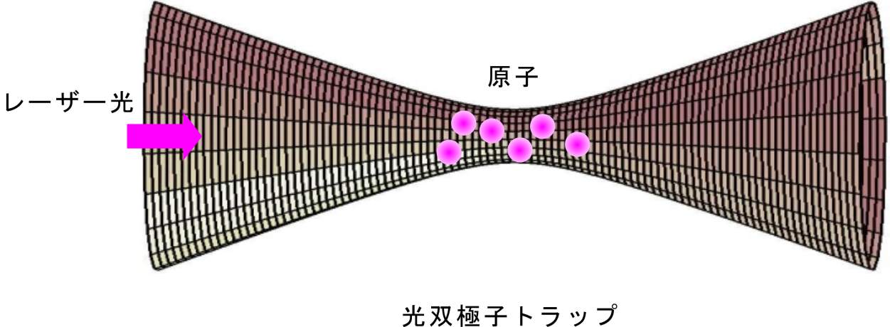 またレーザー光をレンズを用いて集光すると原子は光の強度が最大のところに集まるような力を受け、原子を空間的に閉じ込めることができます。これは光双極子トラップと呼ばれ、レーザー冷却によって得られる極低温原子を微小な領域に安定に1秒以上にわたって閉じ込めることができます(下図右)。