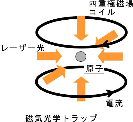 このレーザー冷却は通常、レーザー光と四重極子磁場を組み合わせて用いた磁気光学トラップと呼ばれる方法を用いて行われ、この方法によって秒速10cm以下の温度100mK以下の極低温原子を生成することが可能です(下図左)。