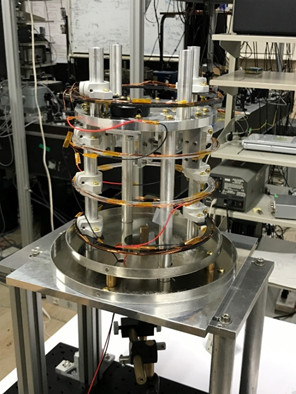 現在、文科省の光・量子飛躍フラッグシッププログラム(Q-LEAP)において、この量子慣性センサーの研究開発を行っており、地球物理や資源探査などの分野で利用可能な小型で高性能な重力加速度計の実現を目指しています。2020年度は、開発した原子干渉計の基本動作の確認を行い、干渉信号より重力加速度の測定を行っています(図1)。また小型の可搬型重力加速度計の開発に取り組み、小型のガラスセルを用いた超高真空装置からなる原子干渉計のセンサーヘッド部の開発を行いました(図2)。既に開発した可搬型のレーザー光源と組み合わせることにより、実験室外のフィールドに移動可能な可搬型の重力加速度計が実現可能となります。このため、この開発した装置の動作確認および、性能評価を行って、実用化を行っていく予定です。